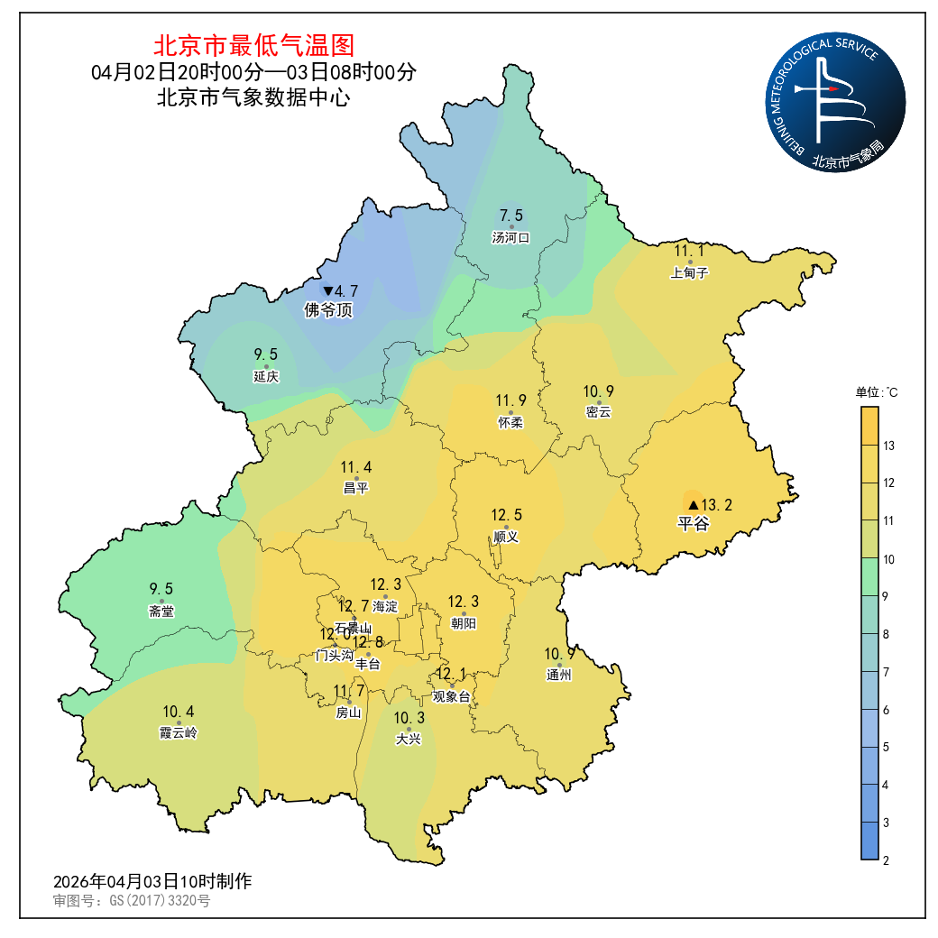 4月2日20时至3日08时,观象台最低气温12.1℃(06:25)。