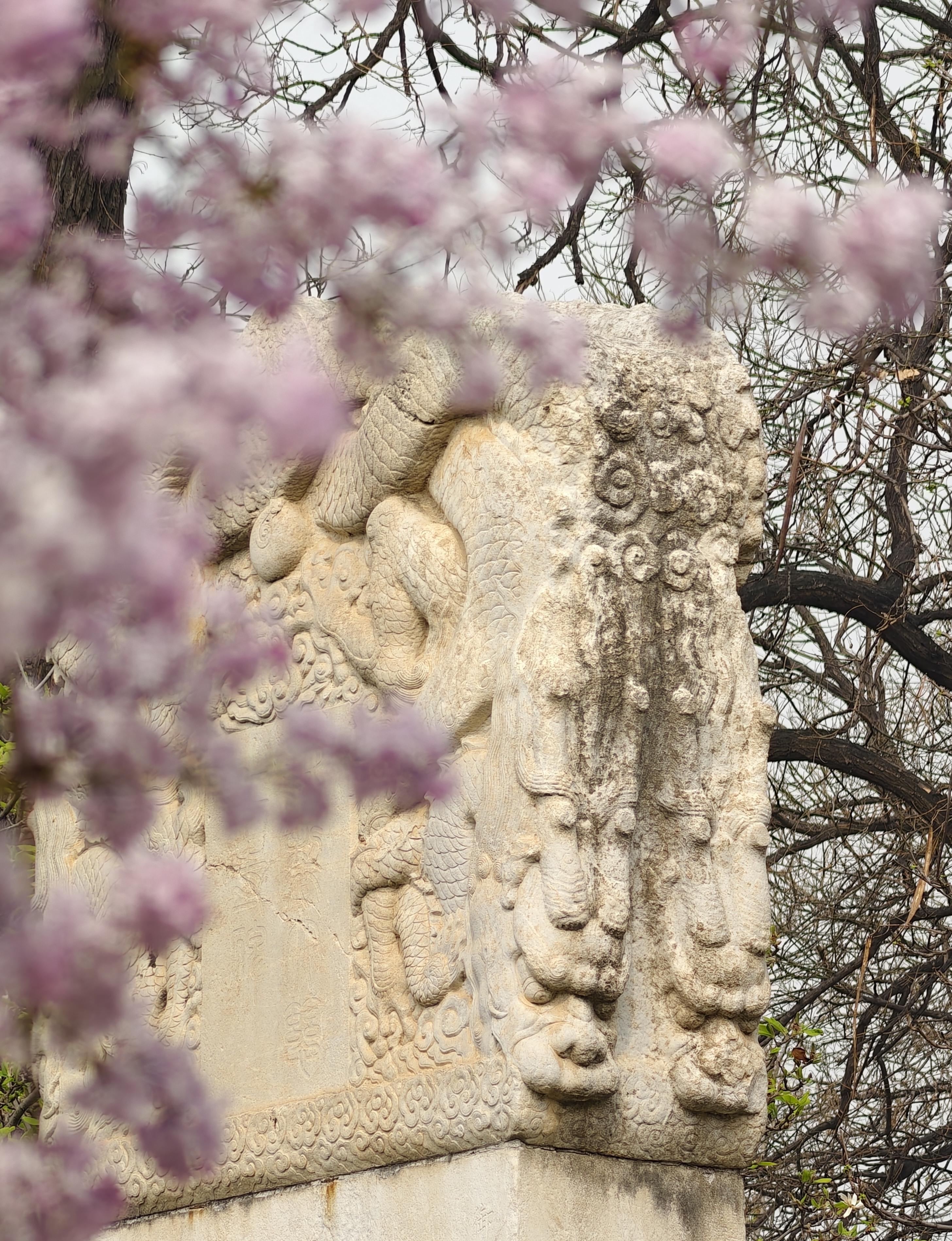 粉花映着朱门,新叶衬着古碑,春日的生机与千年的古韵在此刻完美交融。阳光穿过花影,在青石板上洒下斑驳的光斑,连石狮的纹路里,都落满了春日的温柔。