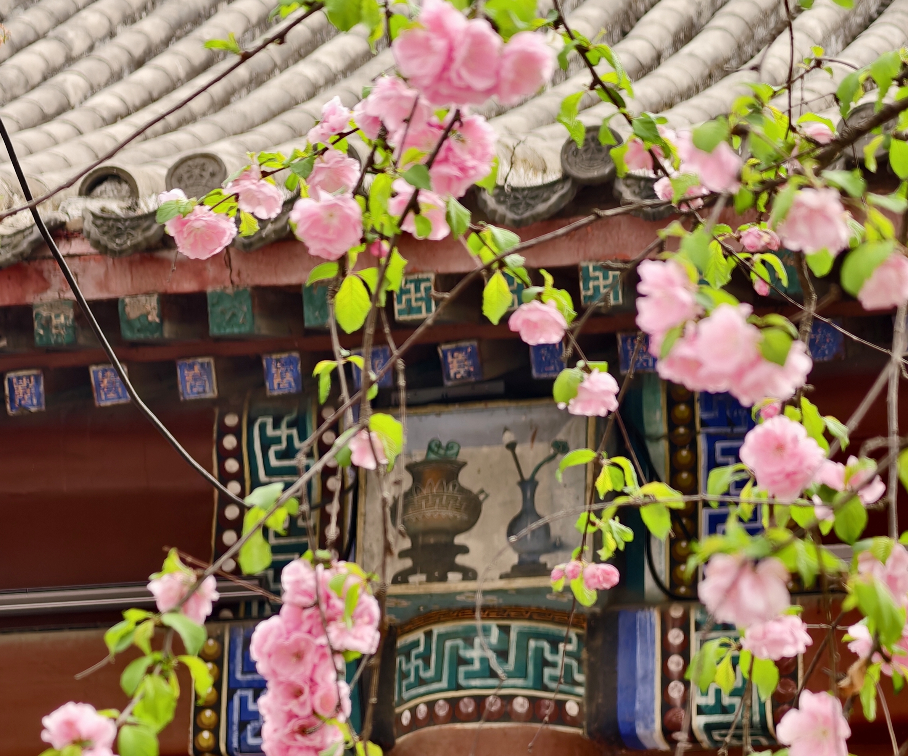 粉艳的花串缀满柔枝,像一串串垂落的胭脂灯笼,在朱红的殿宇前晕开一片绯色云霞。花瓣薄如蝉翼,在风里轻轻颤动,把石狮子的威严,都衬得温柔了几分。