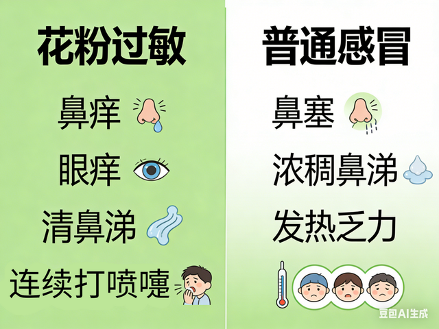 每年这个时候,很多人会把花粉过敏的症状当成普通感冒,自行服用感冒药,不仅没有效果,还可能延误护理时机。大家可以通过以下几点快速区分两者,避免误判: