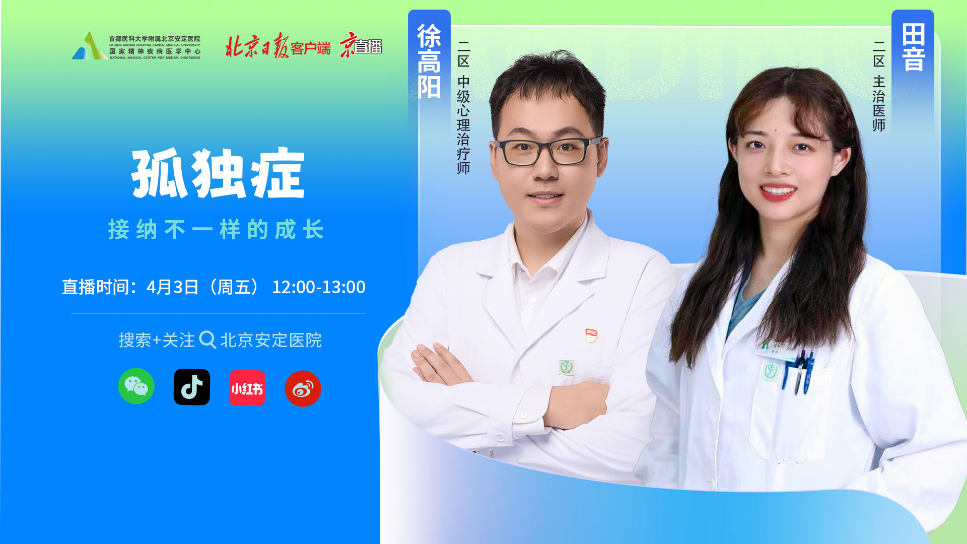孤独症是一种神经发育障碍,早期识别与科学干预将直接决定孩子的成长轨迹。但目前大众对孤独症普遍存在认知误区,常将其与“性格孤僻”“不说话”划等号,导致孩子错过最佳干预时机,家长也陷入无助与迷茫。4月2日是世界孤独症日,我们邀请到了来自首都医科大学附属北京安定医院的两位专家,详解孤独症常见误区,解读社交困难与正常发育的区别,分享家长可落地的干预方法,更结合真实案例,用专业视角为家庭保驾护航!直播时间:4月3日 12:00-13:00