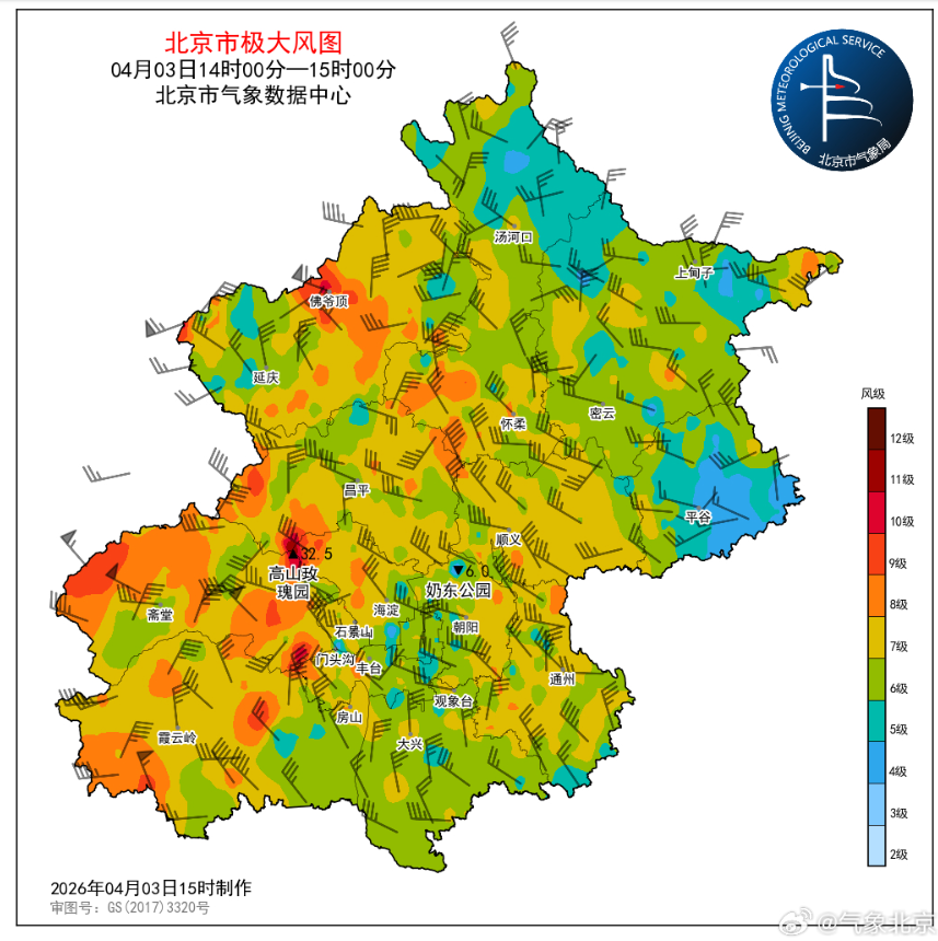 14至15时,北京7级及以上风有346个站(占比50.5%), 8级及以上风有104个站(占比15.2%),全市极大风速为门头沟区高山玫瑰园25.2m/s(10级),平原地区极大风速为丰台区卢沟新桥19.7m/s(8级)。
