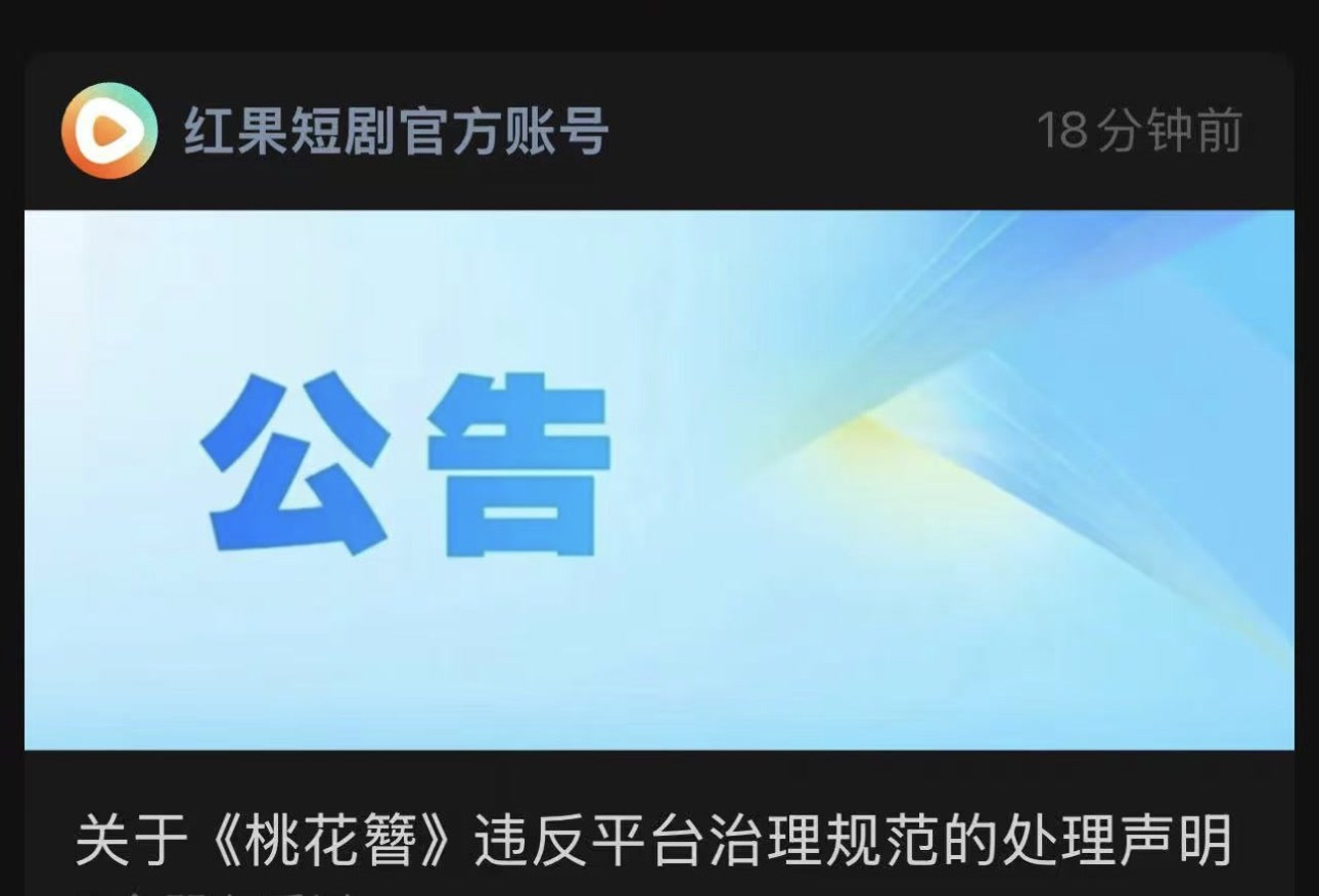 4月3日,红果短剧发布“违反平台治理规范的处理声明”,宣布对因AI侵权引发舆论关注的短剧《桃花簪》作出处罚:该剧全面下架,出品方被暂停上传所有剧集15天。