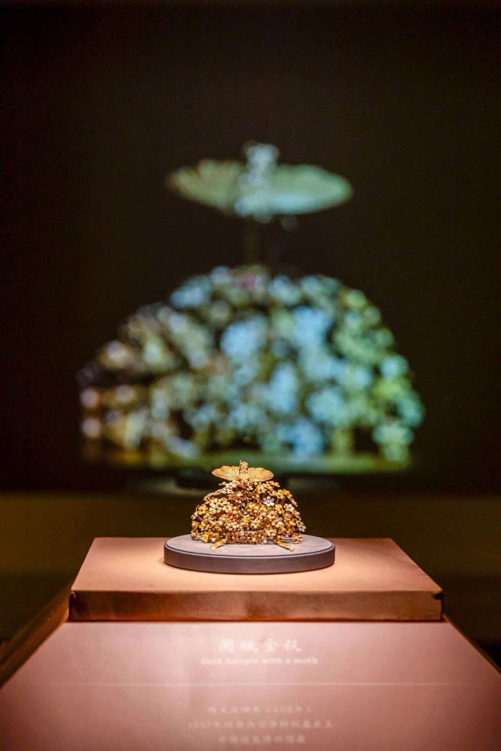 李静训金银珠花头饰是很多影视剧出圈造型的灵感来源,被形象地称为“闹蛾冠”。头饰造型别致,钗首制成金银丛花状,椭圆形。金花蕊中均嵌一珠,丛中有含苞待放的蓓蕾。这是当时贵族阶层妇女头饰的代表,其制作工艺精湛,运用了许多高难度的金银加工手法。