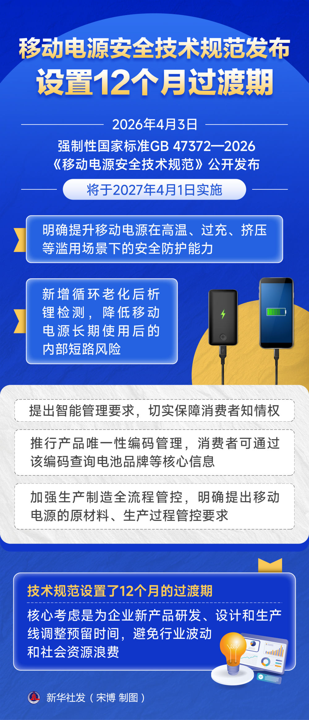 2026年4月3日,强制性国家标准GB 47372—2026《移动电源安全技术规范》公开发布,将于2027年4月1日实施,明确提升移动电源在高温、过充、挤压等滥用场景下的安全防护能力,新增循环老化后析锂检测,降低移动电源长期使用后的内部短路风险。