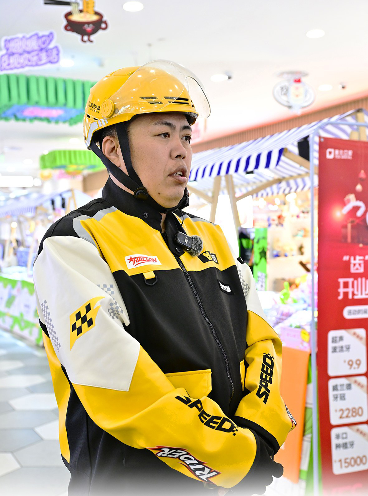 7:30,我在九棵树附近的一家早餐店找到了陈文林。他面前摆着一碗豆腐脑和两根油条,正一边刷手机,一边享受热气腾腾的早餐。黄色的工服还没穿上,只套了件黑色卫衣,头盔放在桌子上。