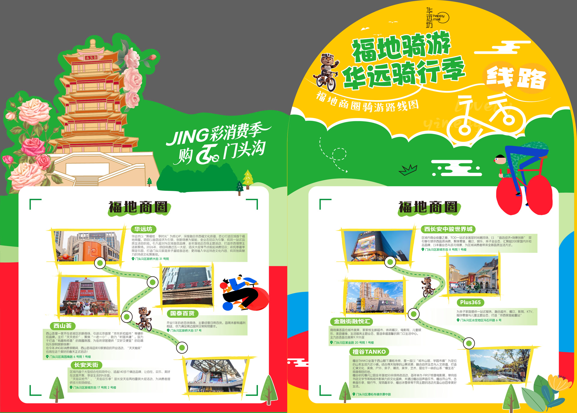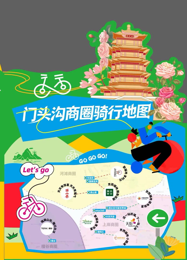 三大商圈各有特色,骑行途中可按需打卡:河滩商圈里,华远坊作为沉浸式主题商业,有不少区域首店,近期还将开启福地寻春潮玩生活节,户外音乐打卡与超值团购同步上线;老牌国泰百货品类齐全,是本地居民日常消费首选;西山荟高性价比亲民,生鲜、便民服务一站式搞定。上岸商圈中,长安天街推出黄金品牌超值补贴,亲子、餐饮业态丰富;中骏世界城品牌云集,不仅是年轻人打卡地,还将引入“2026世界杯・盒里酷3V3足球嘉年华”,更有自在生活节、后备箱市集等活动;Plus365主打亲子业态,遛娃体验拉满;金融街融悦汇主打高端品质,满足精致消费需求。檀谷商圈依托潭柘寺底蕴,有靠山市集、春日音乐会,藏着山野慢生活,是骑行驶向自然的绝佳打卡点。