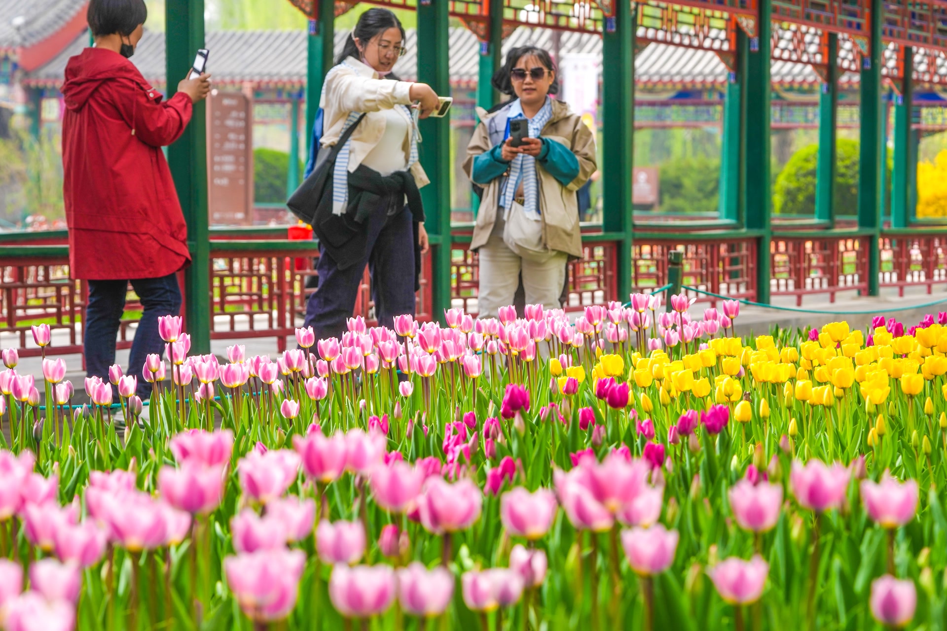 中山公园内,各色郁金香竞相绽放,各色花朵与红墙古建筑相互映衬,一场融合文化体验、沉浸式剧本游戏与品牌消费的春日文旅盛宴启动。活动以郁金香从“天山之源”至“东方回响”的千年传播路径为叙事线索,在园内打造七大丝路主题驿站。每一驿站均结合地域文化特色与花卉艺术设计,串联成一条郁金香“丝绸之路”。移步换景间,游客可以沉浸式感受东西方文明交融的花语之美。