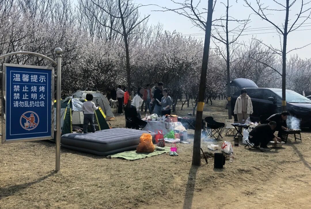 更有甚者,即使现场有明确“禁止烧烤、禁止明火、请勿乱扔垃圾”的警示牌,旁边仍支起不少烧烤炉。河道边,另一块警示牌及广播也反复提醒禁止捕鱼、野外用火、倾倒垃圾等,可不少露营者依旧置之不理,带着孩子直接到河边垂钓、玩耍。