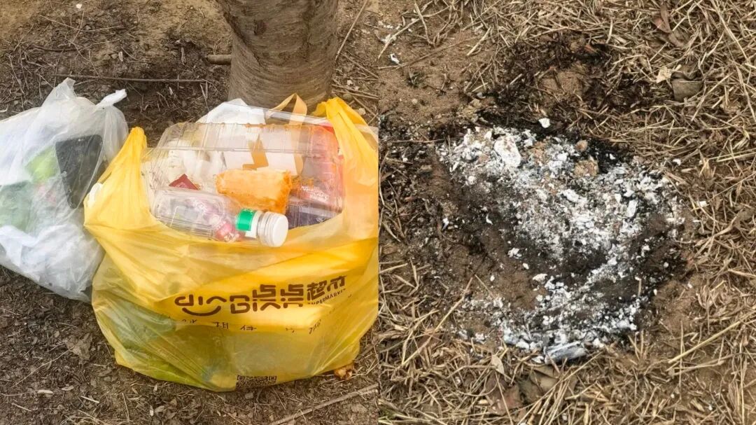 有些露营者离场后,却没能都把垃圾带走。装有餐盒、饮料瓶和食物残渣的袋子敞口堆放在树底下。被丢弃的烧烤炉随意搭在废纸箱上,还有部分炭灰散落在干草中。