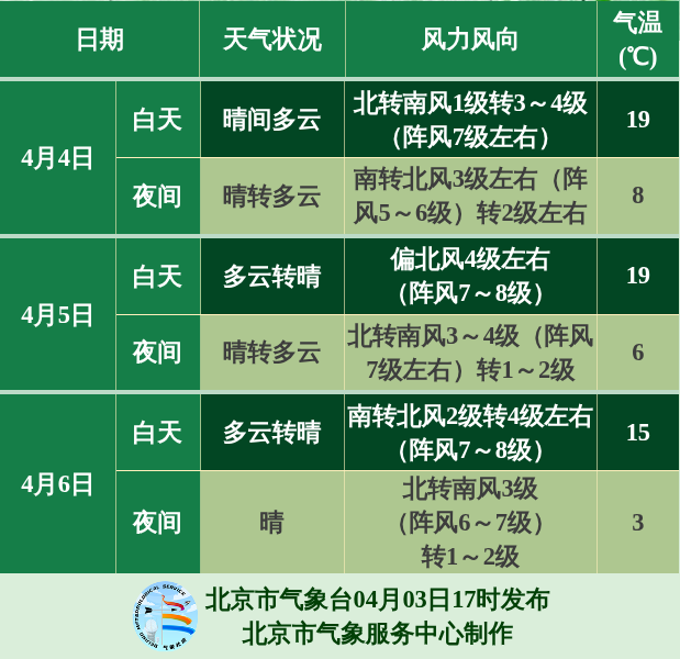 据气象部门预报,清明节期间我市多大风天气,其中,4日中午至傍晚有3~4级偏南风,阵风7级左右;5日白天至前半夜、6日中午至前半夜有4级左右偏北风,阵风7~8级。节日期间大部分时段晴到多云,白天最高气温15~19°C,夜间最低气温3~8°C。