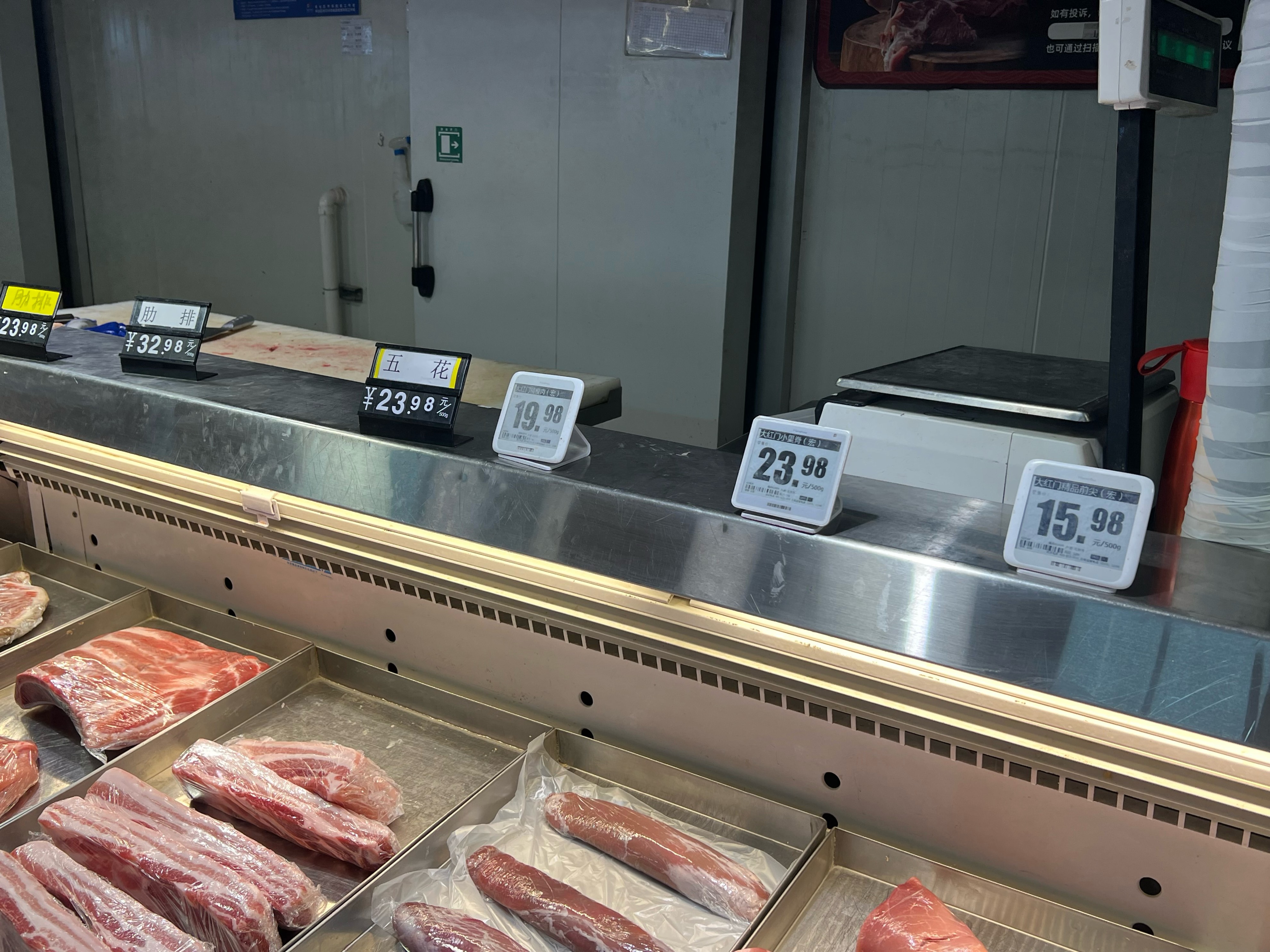 丰台区一家物美超市内,生鲜区不时有顾客驻足。价格牌上醒目标注:前尖肉15.98元/斤,五花肉23.98元/斤。工作人员说:“比春节那会儿便宜了两三块一斤。”