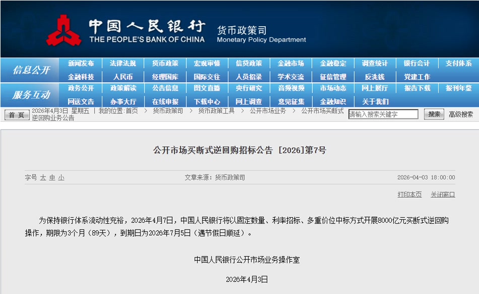 为保持银行体系流动性充裕,2026年4月7日,中国人民银行将以固定数量、利率招标、多重价位中标方式开展8000亿元买断式逆回购操作,期限为3个月(89天),到期日为2026年7月5日(遇节假日顺延)。