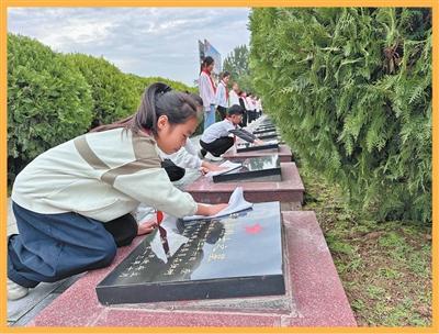 独树镇红军小学学生擦拭烈士墓碑。白万通摄