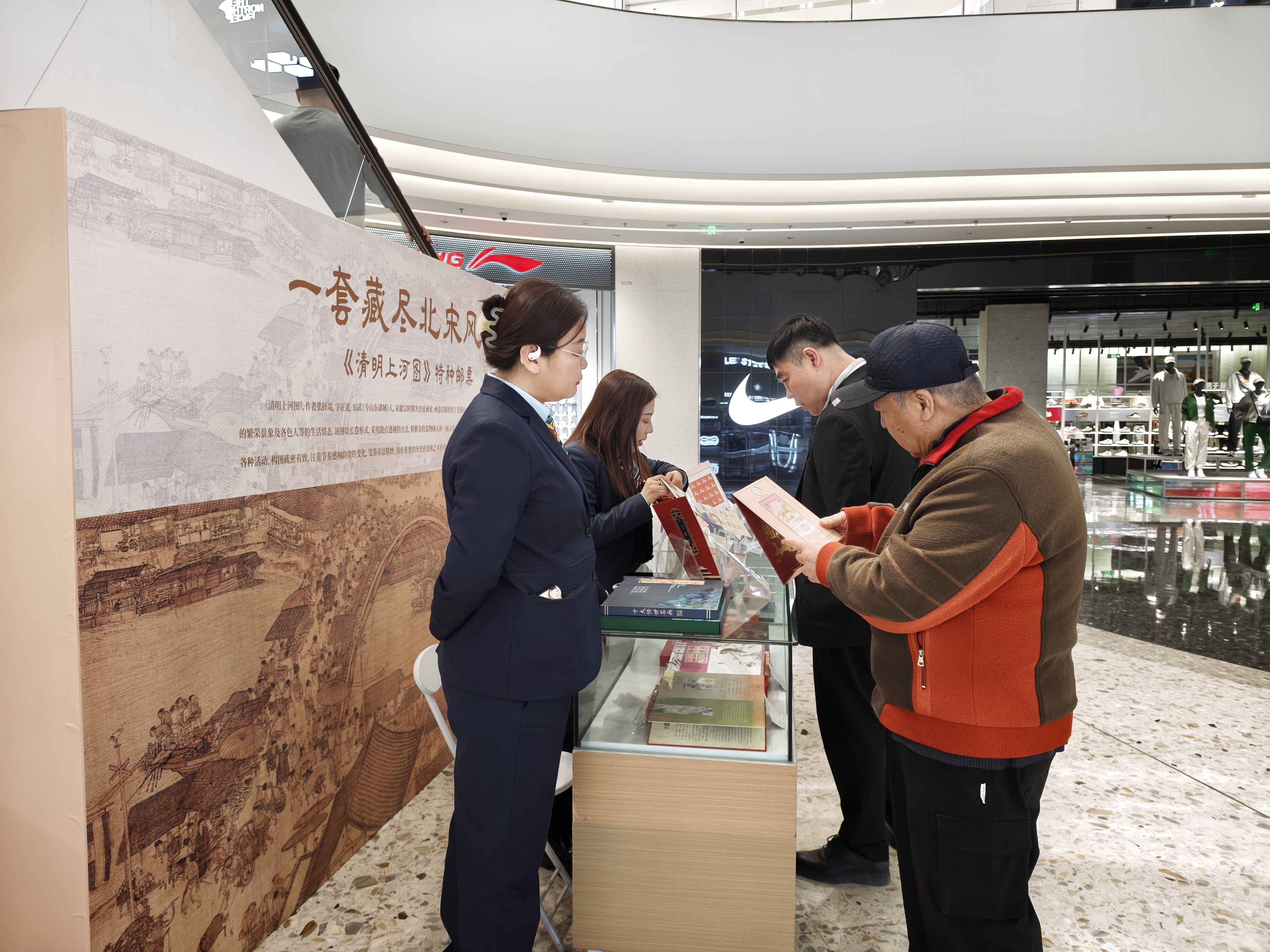 除了静态展示,体验区还设置了互动环节。现场有身着宋式服饰的“市井游人”NPC穿梭其间,通过“画卷寻踪”趣味问答,带领观众深入了解画中的人物故事、风俗细节,实现寓教于乐。中国邮政在此开设的限时快闪店,推出了清明上河图、二十四节气等多款主题邮品供顾客选购。