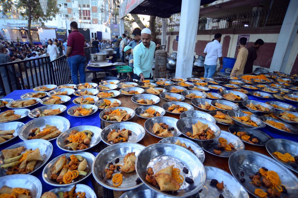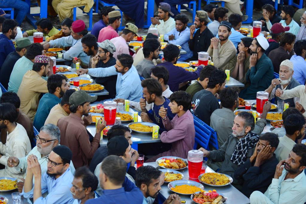 2025年3月17日,人们在巴基斯坦南部城市卡拉奇享用传统美食。新华社发