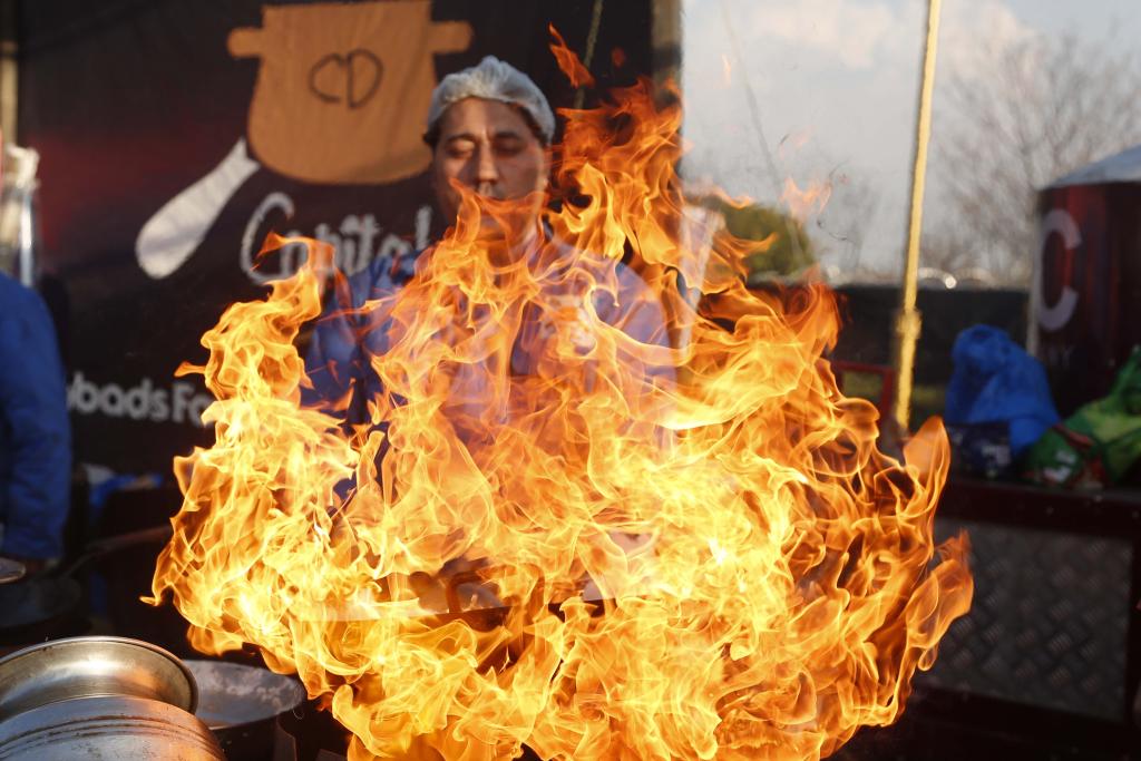 2022年2月26日,在巴基斯坦伊斯兰堡举行的美食节上,一名厨师用大火烹饪食物。新华社发(艾哈迈德·卡迈勒摄)