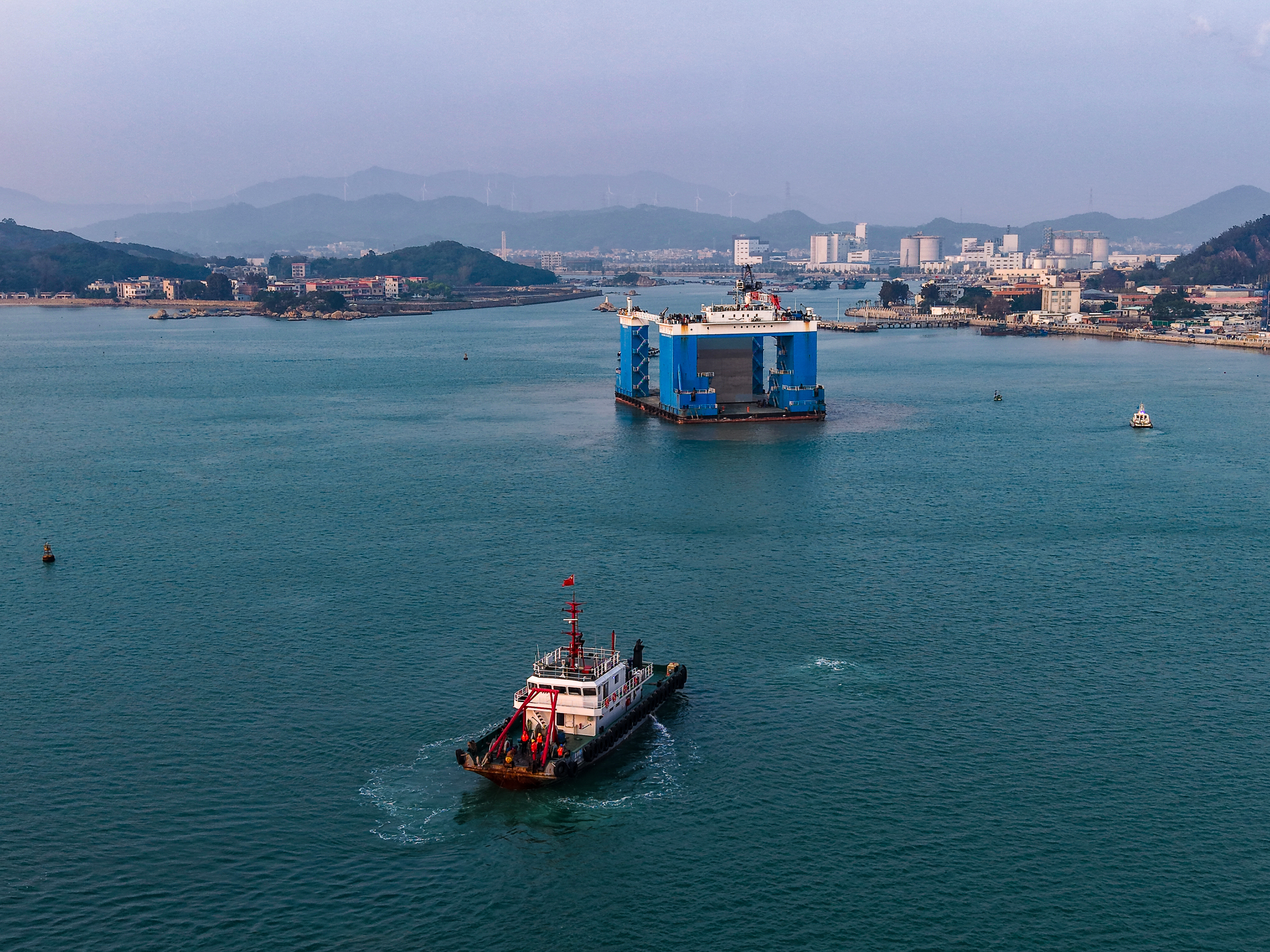 此次安装的首件沉箱体积达1028.8立方米、重约2521吨,是“水域变陆地”的关键一环,由“四航南海”号半潜驳和“粤工拖46”拖轮组成拖运编队,运抵安装现场。