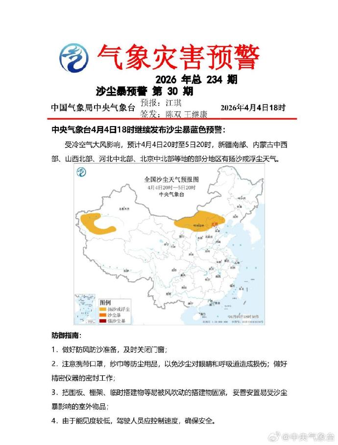 中央气象台4月4日18时继续发布沙尘暴蓝色预警。