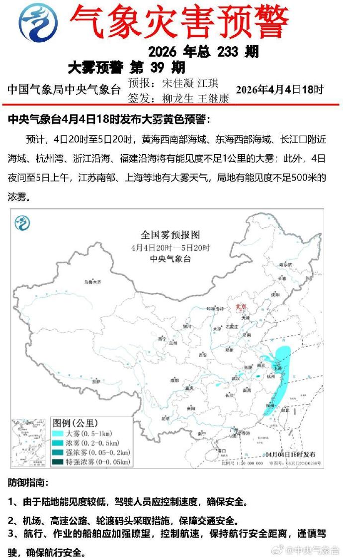 中央气象台4月4日18时发布大雾黄色预警。