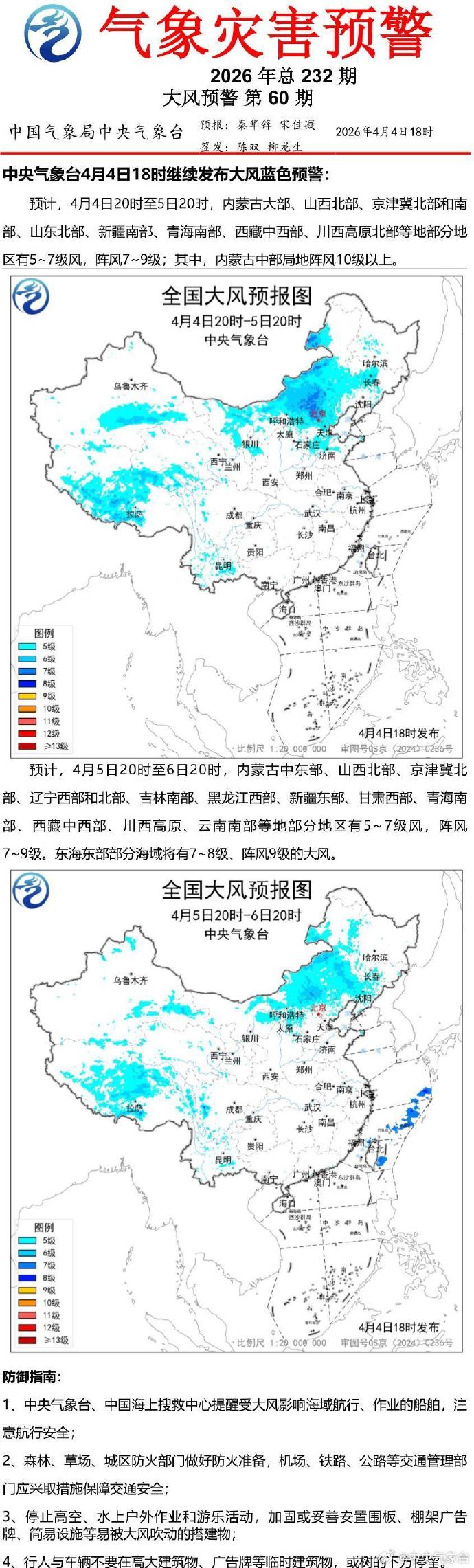 中央气象台4月4日18时继续发布大风蓝色预警。