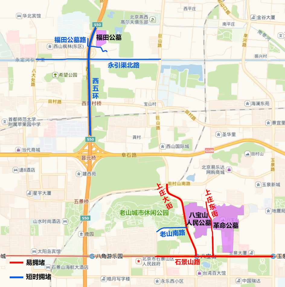 墓地陵园周边道路上午8:00-11:00是祭扫高峰,八宝山人民公墓、八宝山革命公墓周边的上庄大街、上庄东街、石景山路易出现拥堵情况,福田公墓周边的福田公墓路、西五环、永引渠北路可能出现短时拥堵。预计9:00左右,周边停车场车位达到饱和状态。