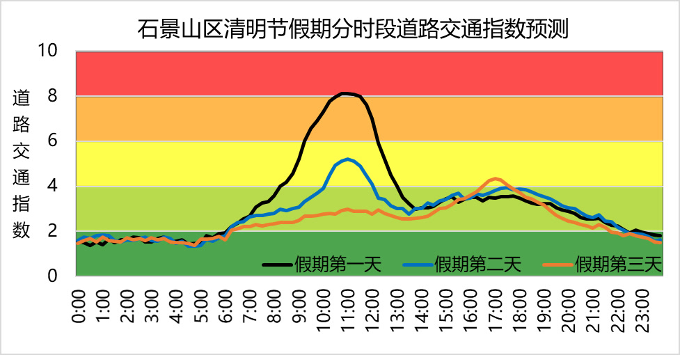 假期第一天早高峰出城客流集中,上午时段路网交通运行压力大,预计石景山区道路网从9:00左右开始进入“中度拥堵”状态,持续至12:00左右结束,拥堵高峰集中在10:30-11:30,下午时段道路网运行处于“基本畅通”级别。