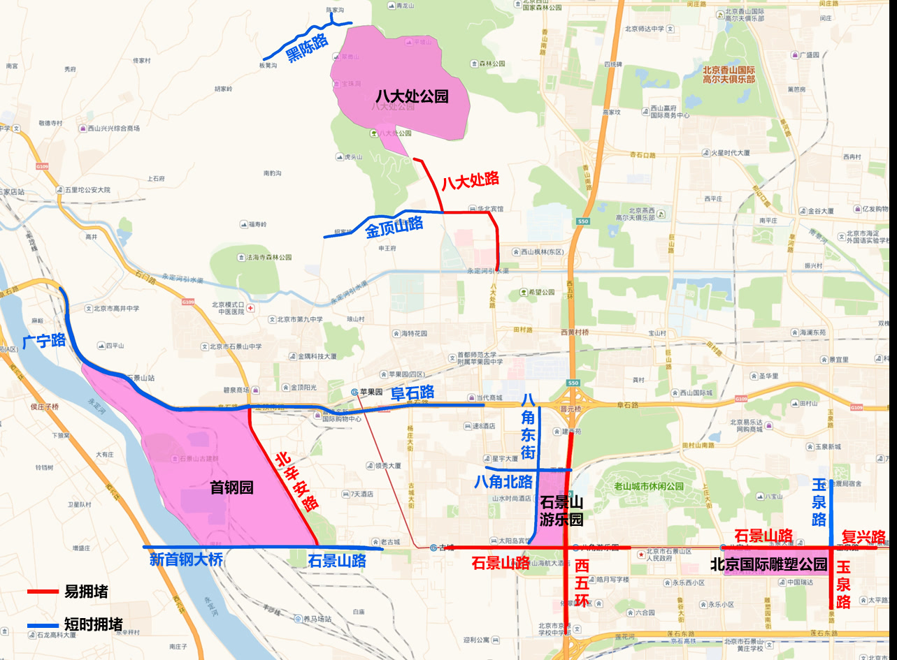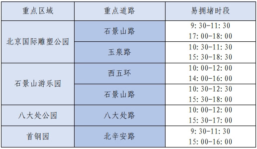 公园景区周边上午10:00-12:00、下午3:00-6:00是出行高峰,北京国际雕塑公园周边的石景山路、玉泉路,石景山游乐园周边的西五环、石景山路,八大处公园周边的八大处路,以及首钢园周边的北辛安路易出现拥堵情况。