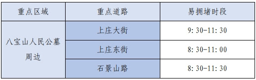 ♦清明假期祭扫高峰时段预计为上午8:00-11:00,八宝山地区周边的上庄大街、上庄东街、石景山路车流量大,早高峰时段道路运行状态预计达到“中度拥堵”。