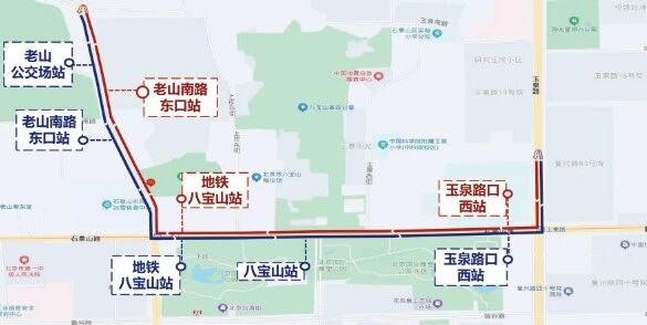 ♦玉泉路地铁站扫墓接驳临线:线路首末站为玉泉路口西站、老山公交场站;上行站位3站(玉泉路口西站、地铁八宝山站、老山南路东口站);下行站位5站(老山公交场站、老山南路东口站、地铁八宝山站、八宝山站、玉泉路口西站)。线路配车12部,发车间隔8-10分钟/班。