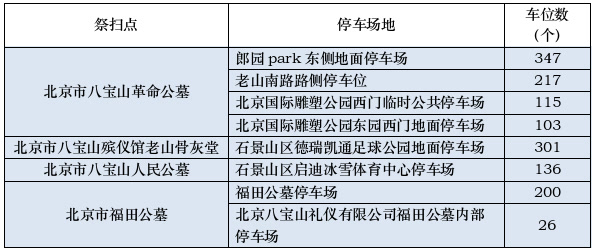 为做好清明祭扫停车服务,区城市管理委统筹八宝山公墓、福田公墓等周边停车场8处,共1445个停车位。