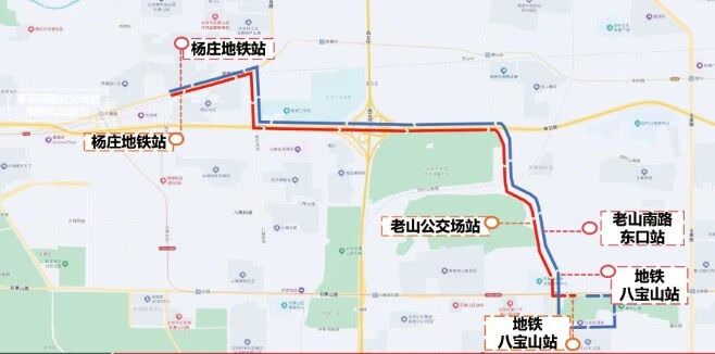 ♦杨庄地铁站扫墓接驳临线:线路首末站为杨庄地铁站、地铁八宝山站;上行站位3站(地铁八宝山站、老山南路东口站、杨庄地铁站);下行站位3站(杨庄地铁站、老山公交场站、地铁八宝山站)。线路配车2部,发车间隔30分钟/班。