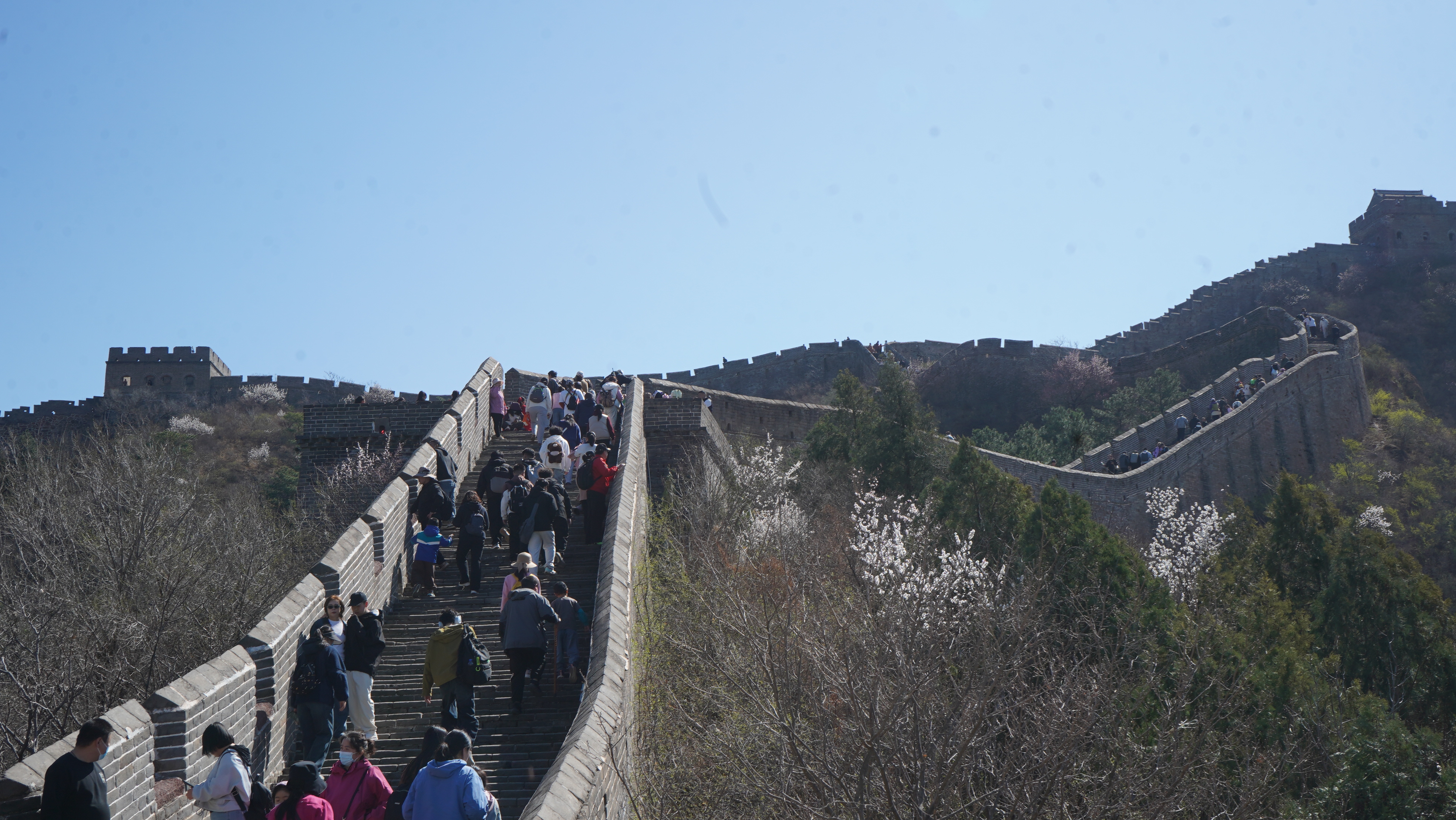 春日的金山岭长城,不仅有杏花的温柔,更有运动的激情与活力。在坡度高达五十多度的花楼天梯,游客手脚并用攀爬而上,征服陡坡后俯瞰花海长城,所有汗水皆化作征服的豪情。