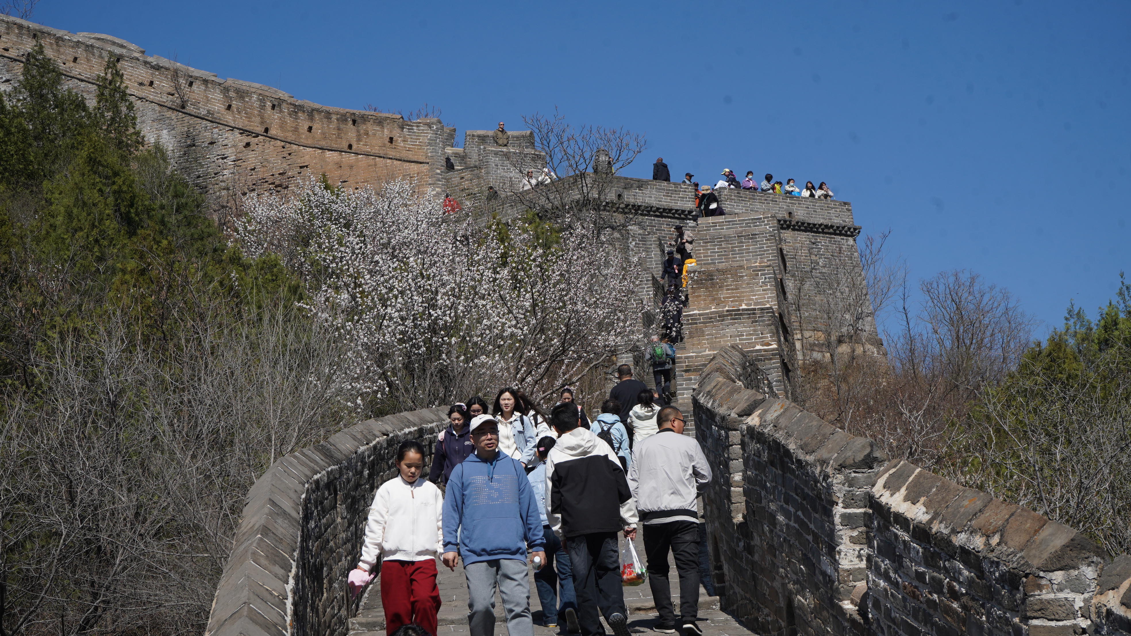4月的金山岭,十万亩野生杏花漫山遍野,如云似霞,是春天赐予的最美礼物。早上登上将军楼,极目远眺,金色的阳光洒于蜿蜒雄关之上,杏花缀满枝头,清风送来淡淡花香,目之所及皆是春日盛景。在车道沟楼东侧马道,粉白花海与雄健城墙刚柔并济,构成一幅动人心魄的天然画卷,游客们或驻足观赏,或合影留念,摄影师们举着相机不停按下快门,定格风景大片。“这也太好看了吧!我要把这张照片设成手机壁纸!”一位年轻姑娘举着相机,对着眼前的美景连连惊叹。
