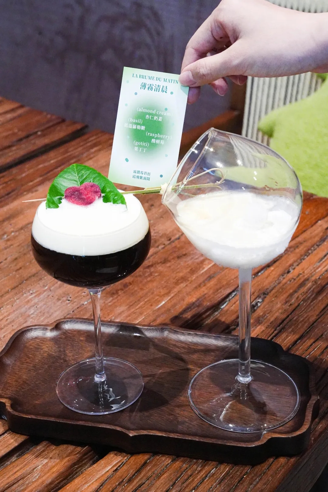 这款特调非常清爽,树莓的明亮果酸被罗勒的草本清香轻轻托住,酸甜之间多了一层植物特有的清新。顶上覆盖一层厚厚的杏仁奶盖,细腻绵密,微咸中带着坚果的香气。