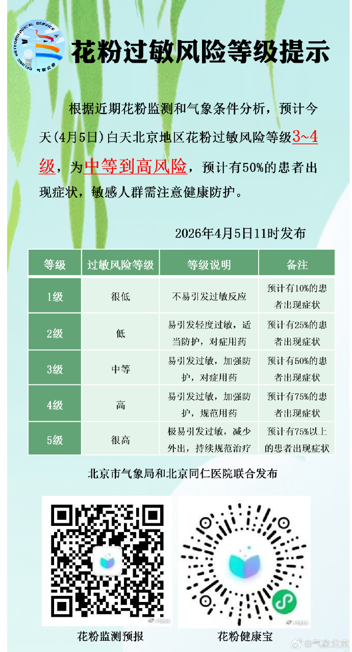 据近期花粉监测和气象条件分析,预计今天(4月5日)白天北京地区花粉过敏风险等级3-4级,为中等到高风险,预计有50%的患者出现症状,敏感人群需做好健康防护。
