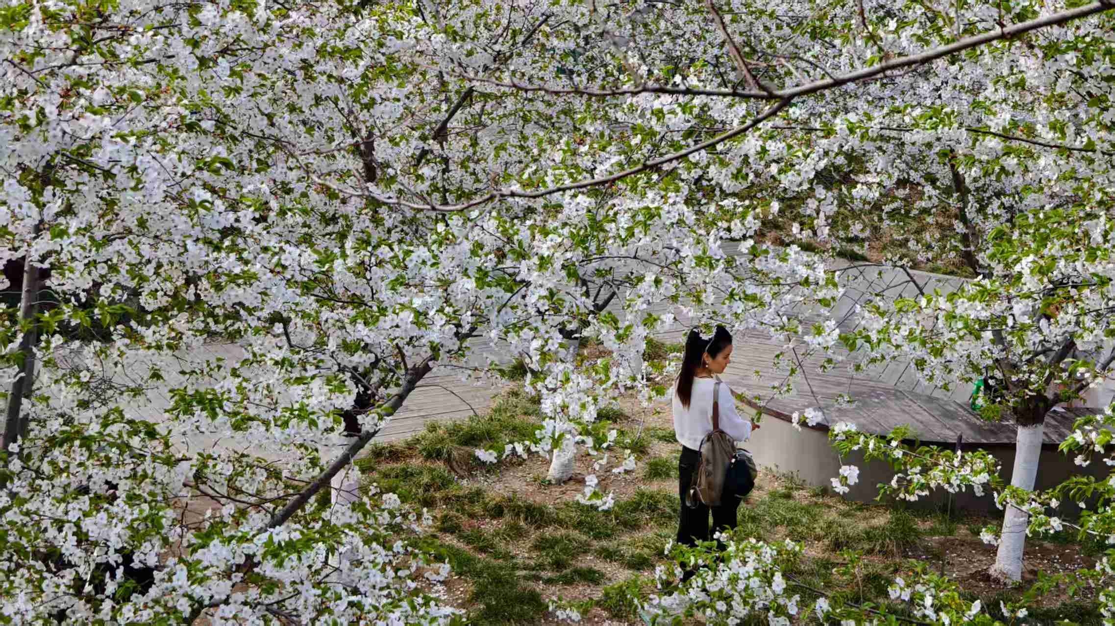 恭王府海棠花开,粉白的花海,朱红的门窗,青绿色彩画,灰砖的墙体完美融合,一幅幅中式美学画卷,吸引大量游客前来赏花。