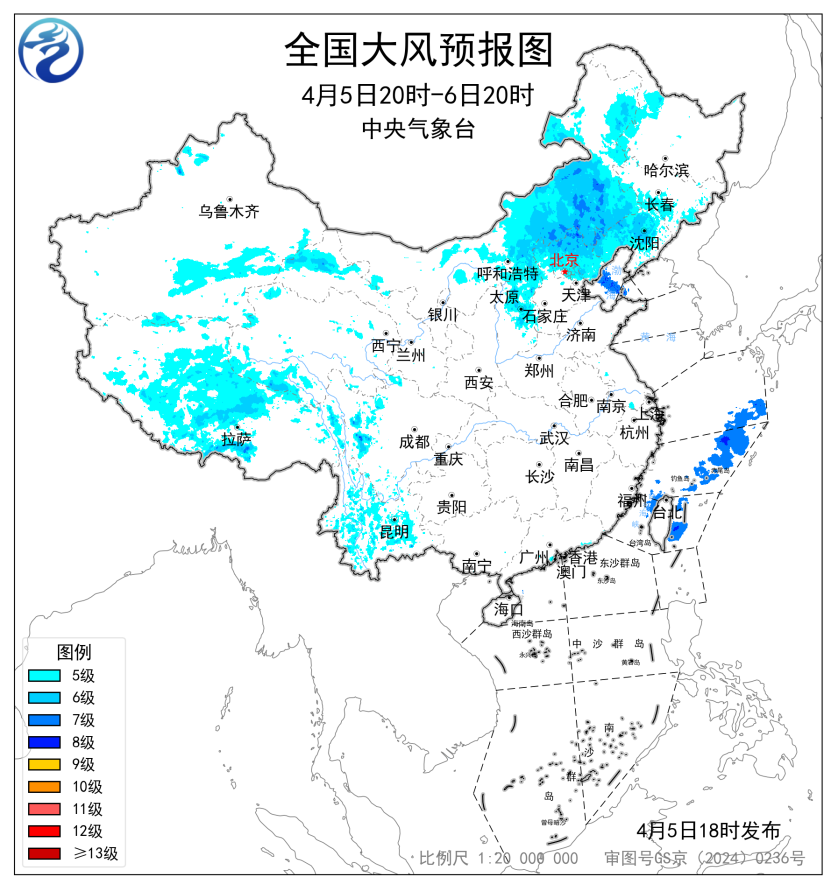 预计,4月6日20时至7日20时,内蒙古中东部、华北北部、黑龙江东部以及新疆北部、甘肃东部、宁夏、川西高原北部、西藏中部、云南等地部分地区有5~7级风,阵风7~9级;东海东部海域、台湾海峡、台湾以东洋面将有7~8级、阵风9~10级的大风。