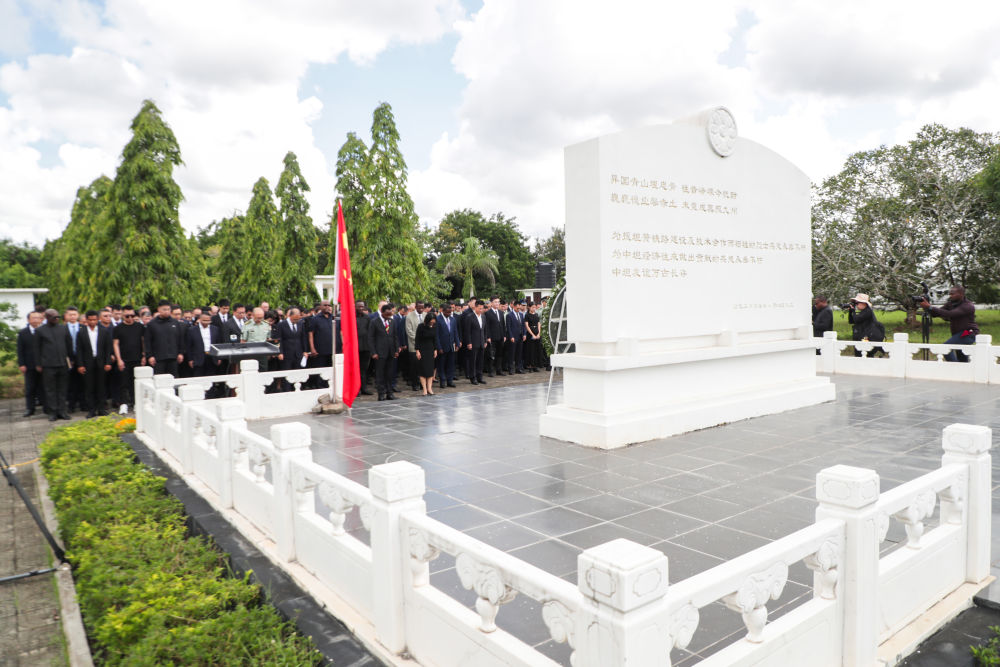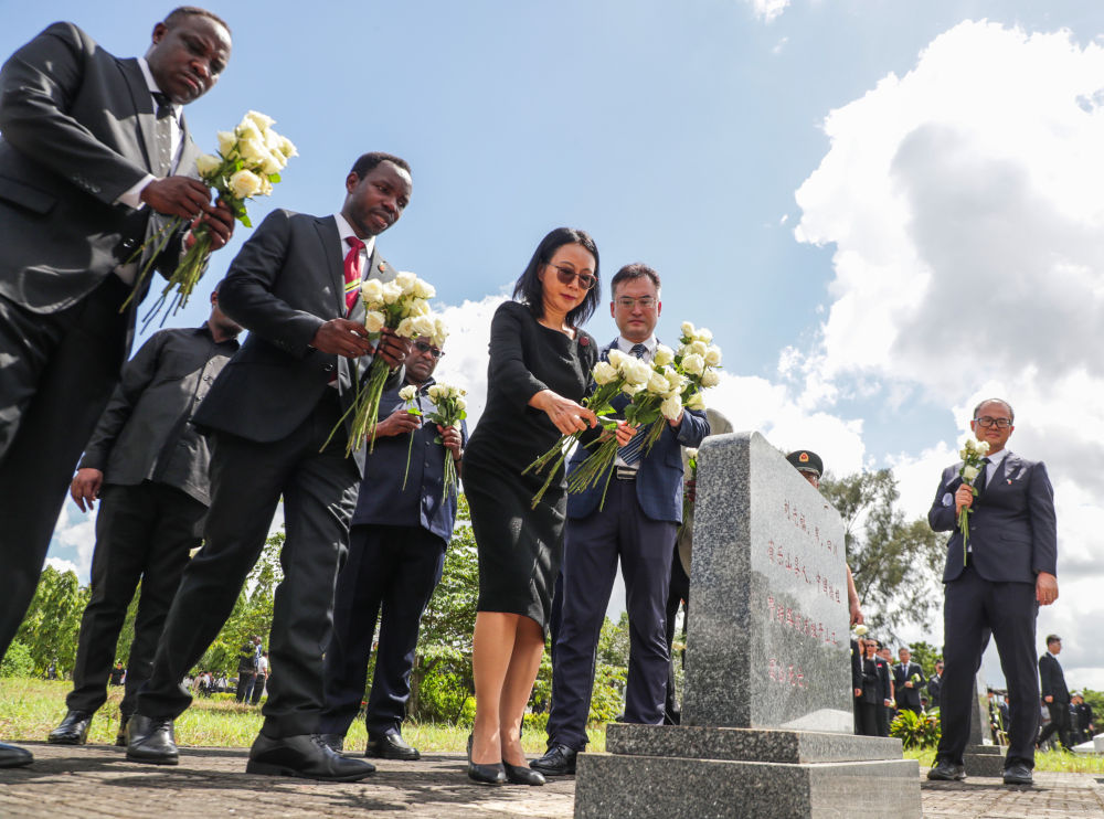中国驻坦桑尼亚大使陈明健与坦桑尼亚内政部长卡坦比并肩走向主碑,轻轻俯身献上花圈。坦政府部门、在坦中资机构、华侨华人及当地各界代表百余人列队而立。
