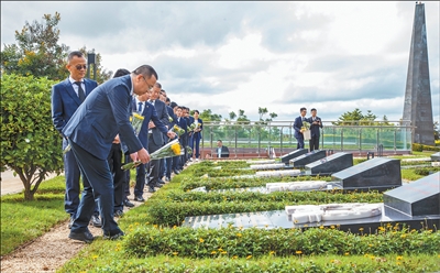中国驻卢旺达大使高文棋日前率使馆全体馆员赴鲁林多烈士陵园祭扫,缅怀在援卢建设中牺牲的中国工作人员。中国援卢医疗队、在卢中资企业和侨胞代表等参加祭扫。高文棋表示,这座陵园是中国援卢人员不畏艰险、甘于奉献的见证,也是“中卢友谊情比山高”的象征。