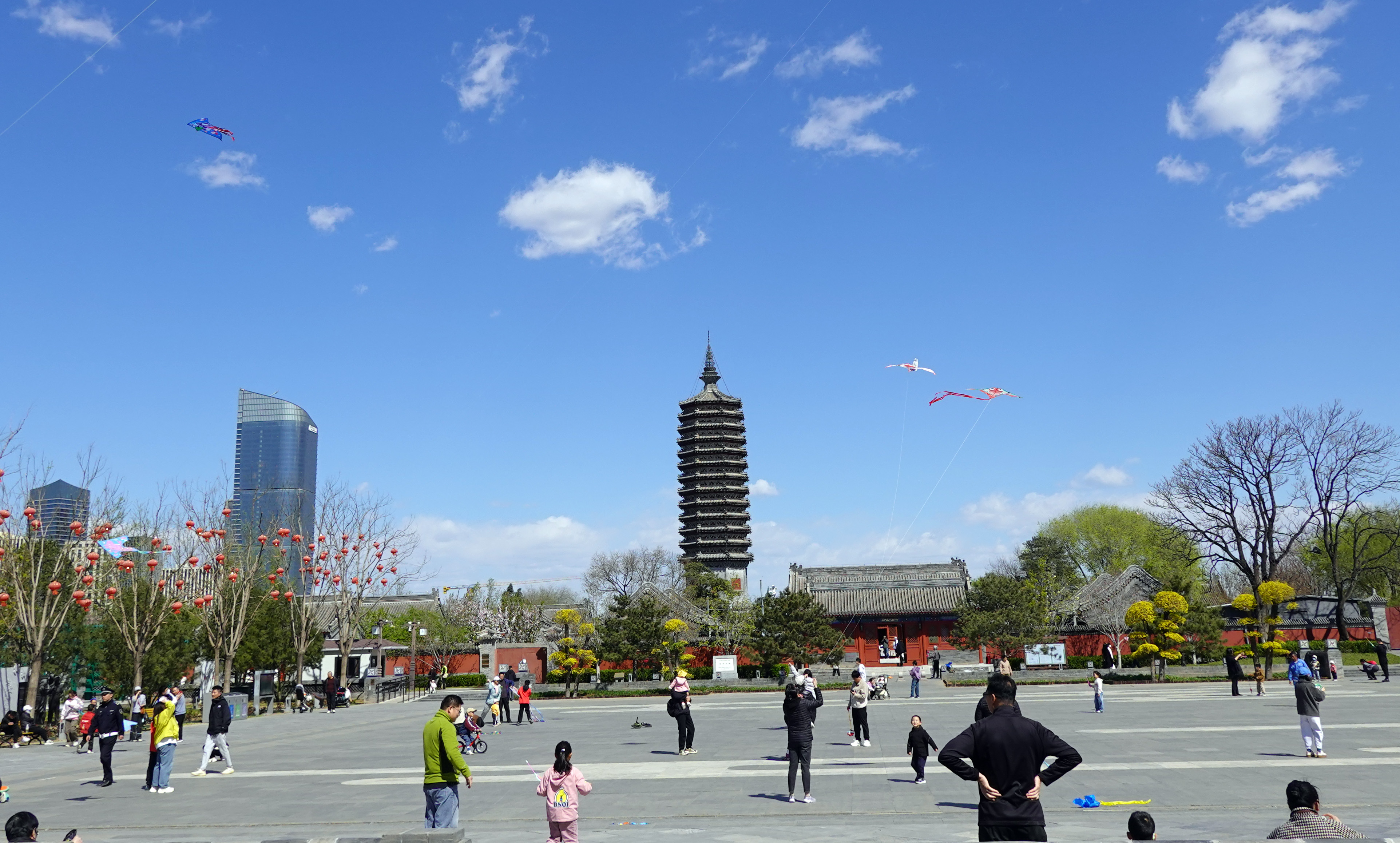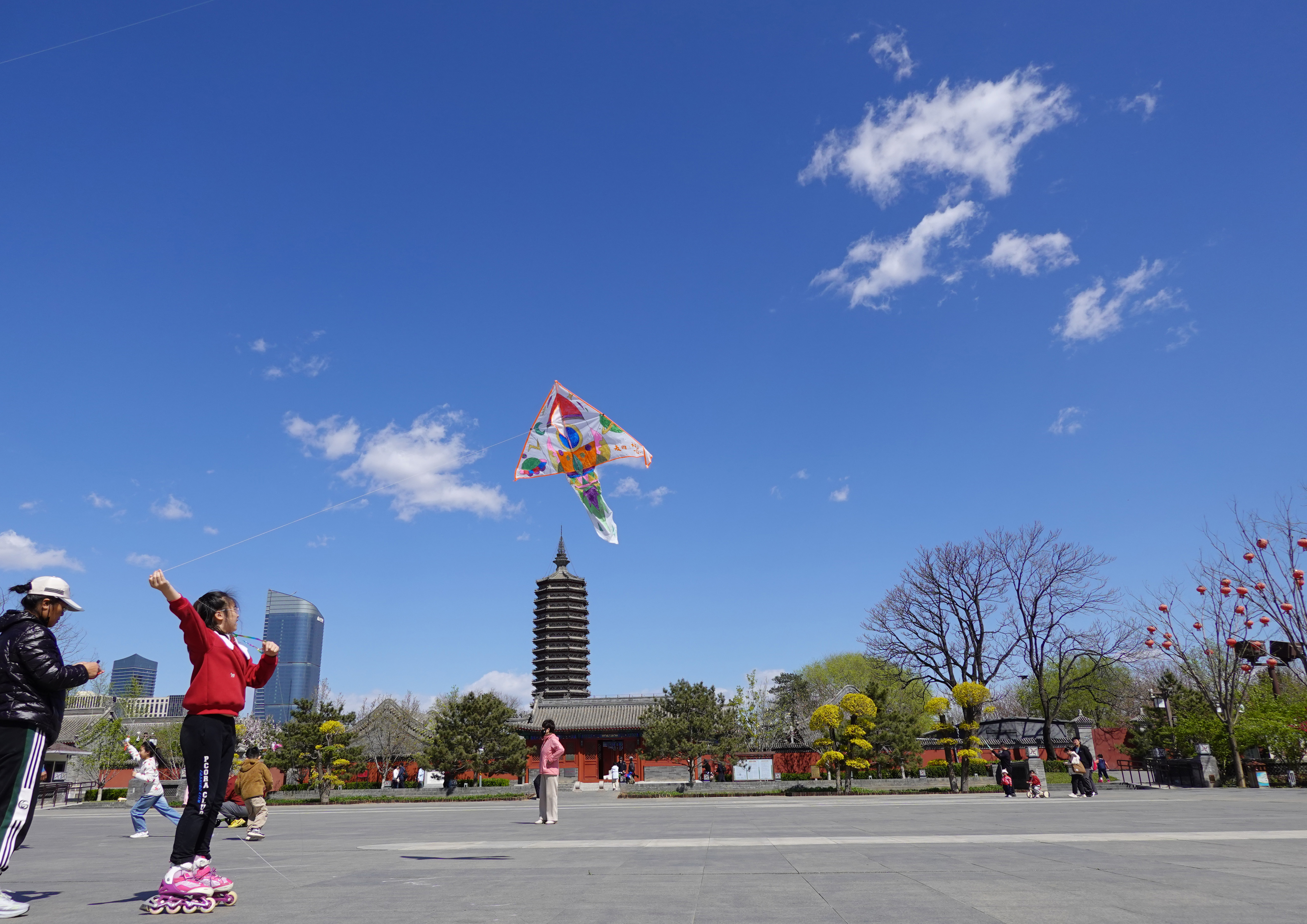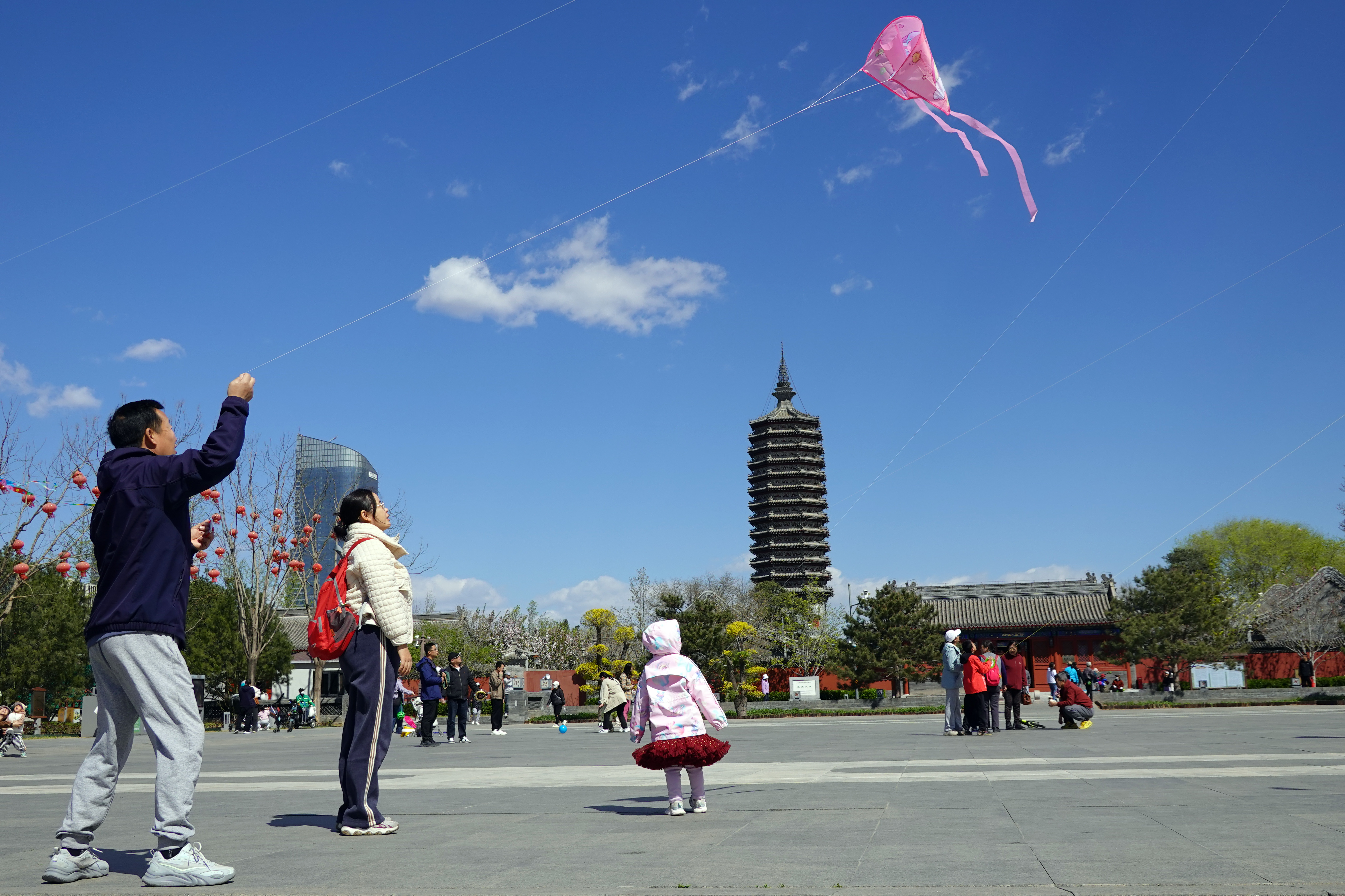 4月6日,清明假期最后一天,北京阳光明媚、春风和煦,市民在通州燃灯塔下泛舟湖上,纸鸢逐春。