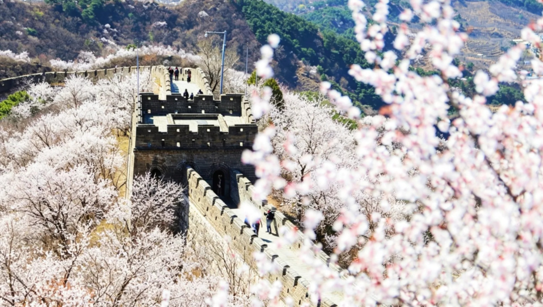 在慕田峪长城,杏花粉白、桃花嫣红,漫山绽放,粉白相间的花朵缀满枝头,随风轻舞,与蜿蜒起伏的长城相映成趣,绘就一幅“长城映花海”的春日画卷。不少游客驻足拍照,尽情享受春日美好。