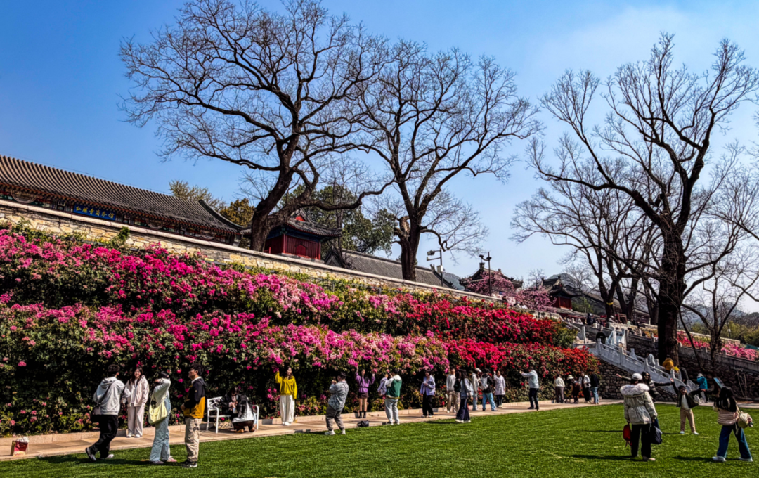 在红螺寺景区,春天则自带一份清雅的禅意。景区内,桃花、玉兰、杜鹃等花卉竞相开放,或嫣红艳丽,或淡雅清新,点缀在古寺殿宇、青松翠竹间,别具韵味。其中,由多色三角梅打造的网红花墙更是“C位出圈”,以绚丽色彩成为大家赏春祈福、拍照打卡的必选点位。