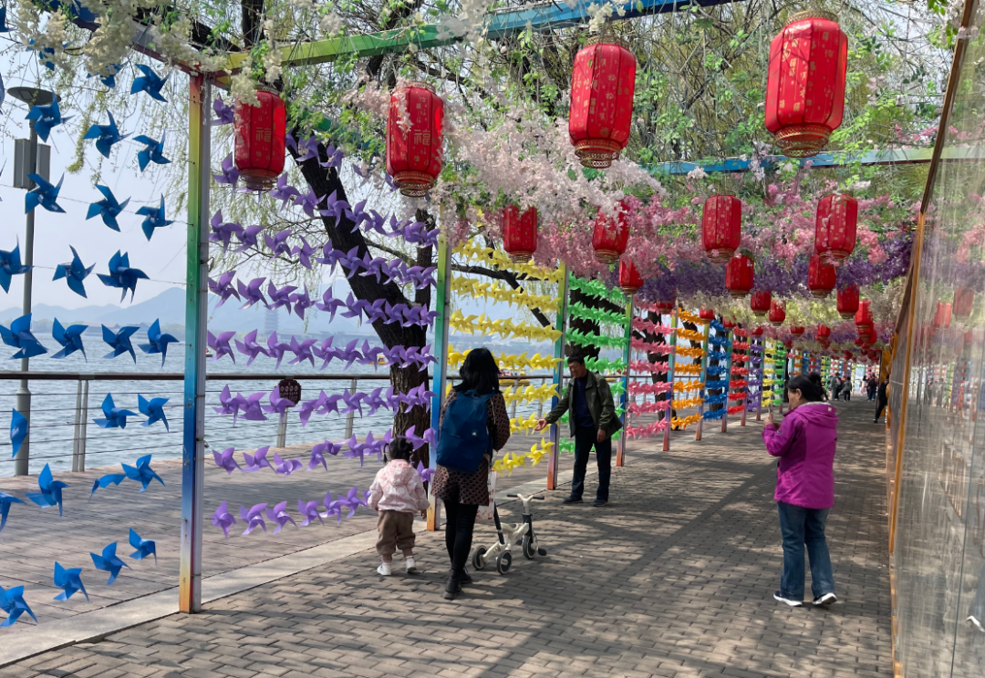 有的游客沿湖漫步,沉浸式欣赏花海美景;有的乘游船穿行湖面,伴着花香感受湖光山色;还有的闲坐湖边的秋千上,在清风中享受春日的闲适与放松。