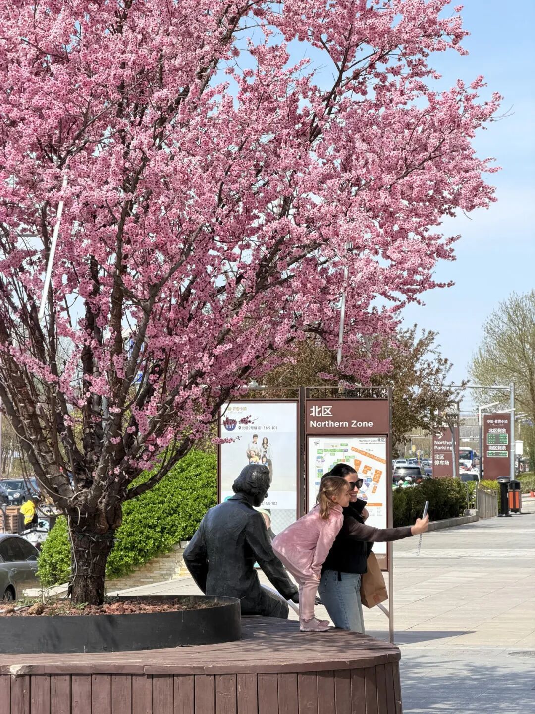 一对母女在花树旁驻足