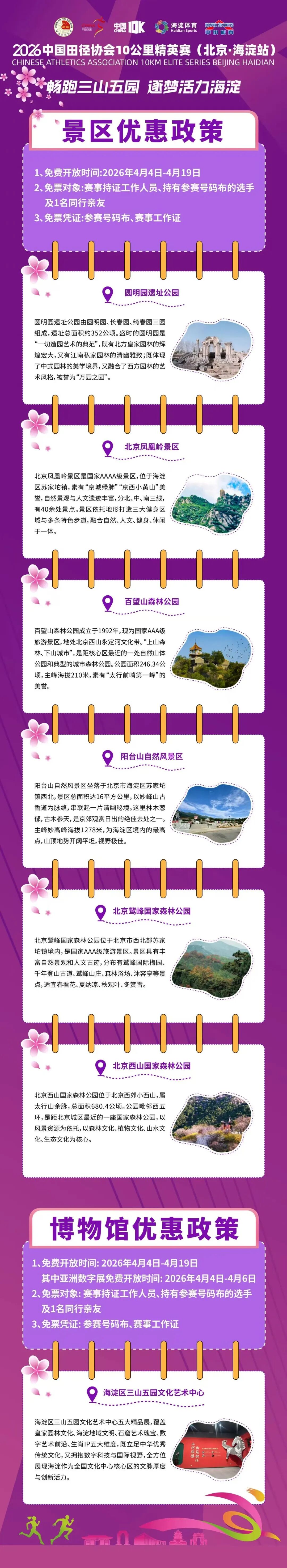 本次海淀首发“号码布经济”全面升级,吸引243家商户参与其中,每一张参赛号码布都将成为专属“消费通行证”——圆明园遗址公园、百望山森林公园、北京西山国家森林公园、阳台山自然风景区、北京凤凰岭景区、北京鹫峰国家森林公园及三山五园文化艺术中心凭号码布免费畅玩,用赛事热度激活文旅活力,让跑友的每一份热爱都有专属回馈!