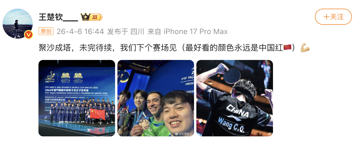 4月6日,王楚钦夺冠后微博发文:聚沙成塔,未完待续,我们下个赛场见(最好看的颜色永远是中国红)