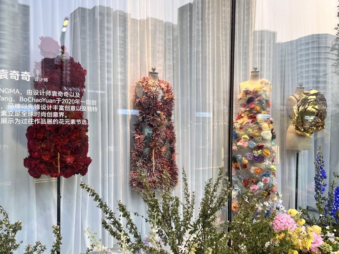 这场春日市集还深度联动了2026秋冬北京时装周的时尚资源。现场设有北京时装周限时橱窗,吸引了不少市民观赏。据介绍,橱窗内的服饰由青年设计师袁奇奇、朱恺怡设计,其中,袁奇奇设计的服装有红色玫瑰、彩色花卉点缀其中的裙装;朱恺怡的设计则更显民族风韵,珍珠、蕾丝、编织工艺均在服装上体现,让这些服饰看起来极具生命力。“逛商场之余,还能看到只有在秀场上才能看到的高定服装,过足了眼瘾!”市民胡女士兴奋地说。