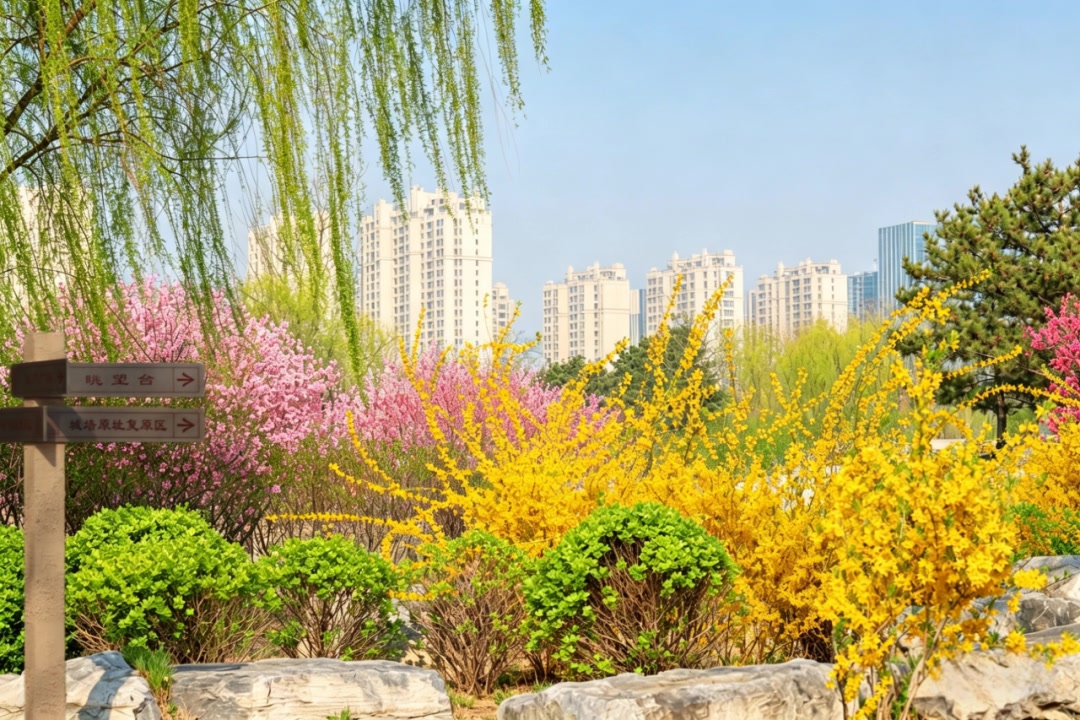 清明假期,路县故城遗址公园春意盎然。步道沿线,连翘、桃花沿着夯土城墙开放,黄粉相间,与古朴城垣形成鲜明对照。