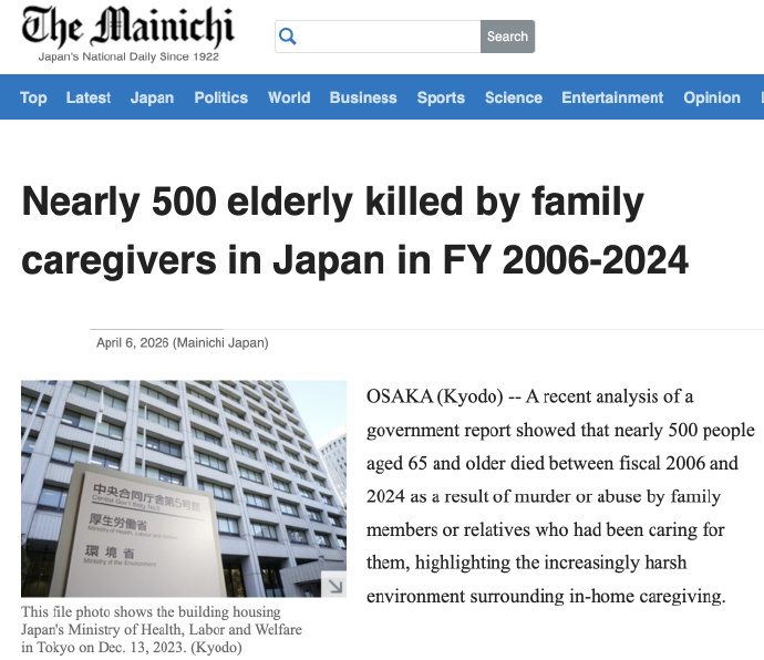 据日本共同社6日报道,日本政府一项最新报告显示,2006至2024财年间,日本共有近500名65岁及以上的老年人因被承担照护责任的家人或亲属谋杀或虐待而死亡。有日本专家指出,已确认的这些死亡案例只是“冰山一角,亟需加强相关支援体系”。
